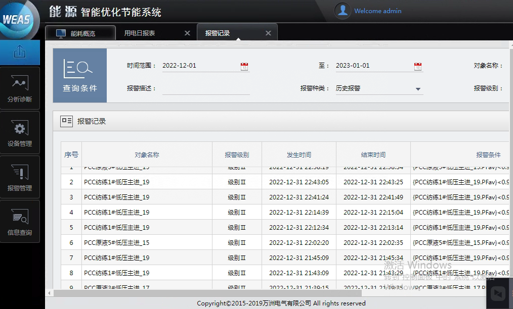 主要是对设置的报警信息进行集中管理,并针对报警信息进行汇总统计分析,分析经常出现问题的故障点、故障次数等,自动生成设备异常管理综合报告。使用报警功能可以对重要的用能设备(低压进线、水泵等)设置用能参数预警,以帮助用能管理者更好的管理和维护重点用能设备,一方面控制主要用能设备的能耗,另一方面关注关键生产设备的运行状态,避免设备故障造成生产的影响。