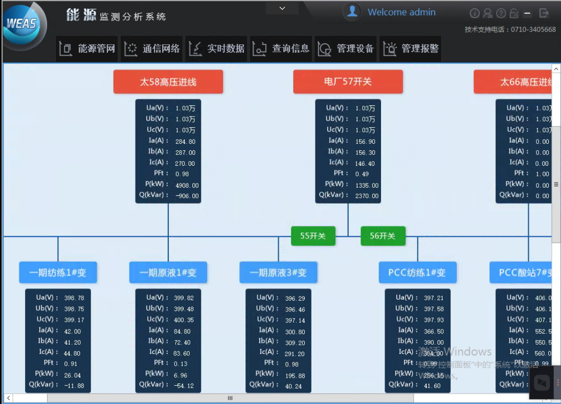 将化工企业用电以配电室为单位,一次图展示全厂的用电结构,并显示各用电单元的实时数据,包括三相电压、电流、有功功率、无功功率、功率因数等。