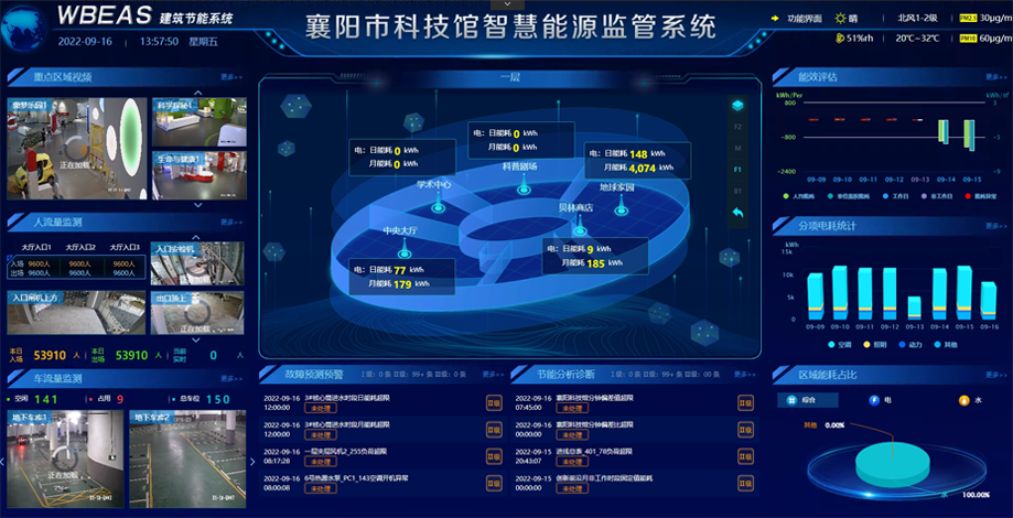 总体概览从建筑物用能情况进行整体展示和分区域展示;能效评估、区域能耗占比、分项电耗统计能耗从建筑指标趋势,用能占比、分项电耗三个维度对建筑能耗情况进行综合展示,便于管理者及时掌握建筑能耗状态数据,逻辑和层级清晰。故障预测预警、节能分析诊断看板在展示上,能够自动推送报警结论,在数据展示上,通过点击进入对应界面,用图形、文字、视频描述报警详情,使用方便,易于理解。