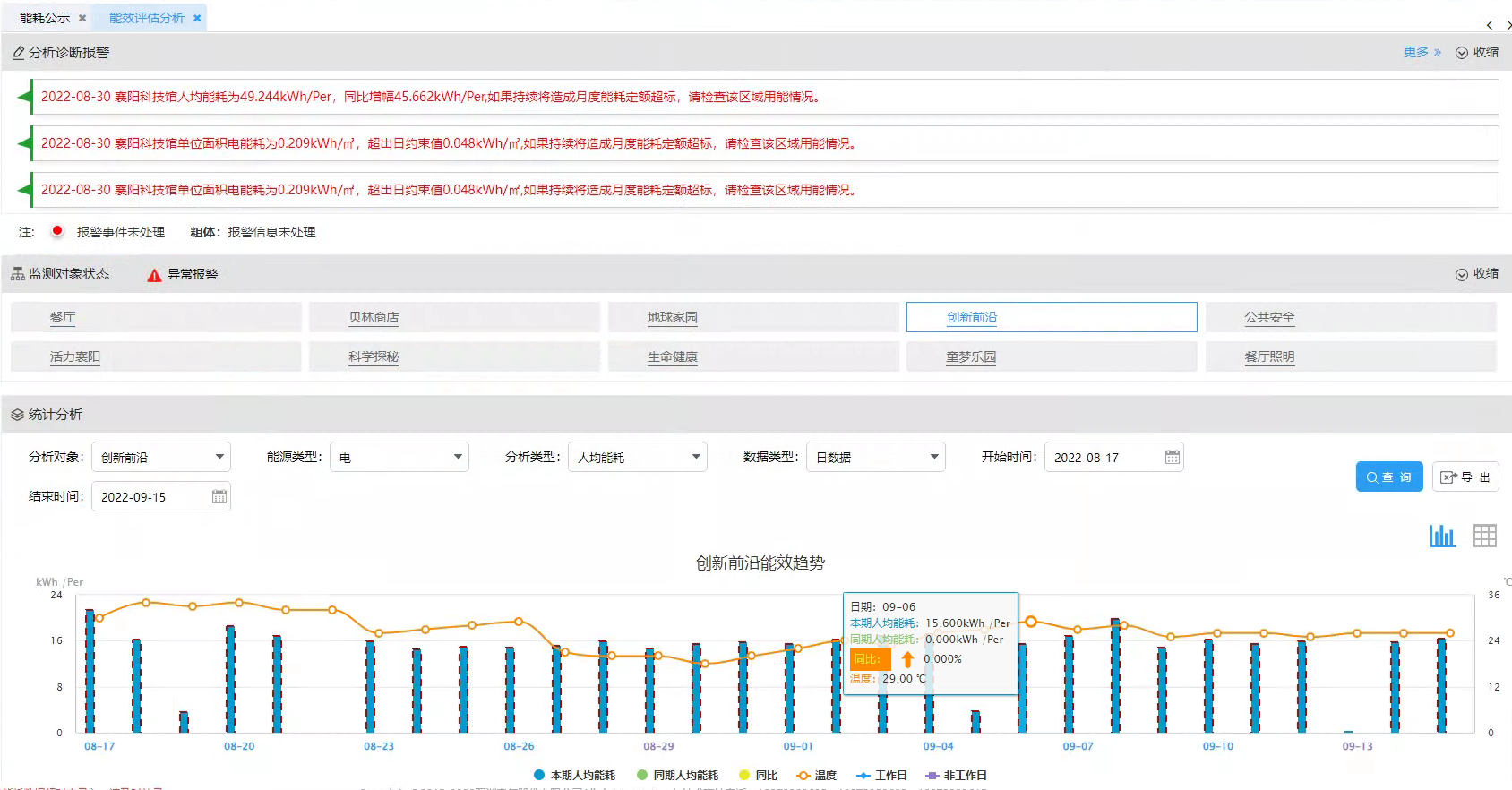 能效评估功能是对整个建筑物和重点区域从单位面积电耗和人均电耗两个维度进行能效评估,以判断当前能效水平是否处于最优状态,便于指导物业运维加强对能效指标超限区域能耗管理。