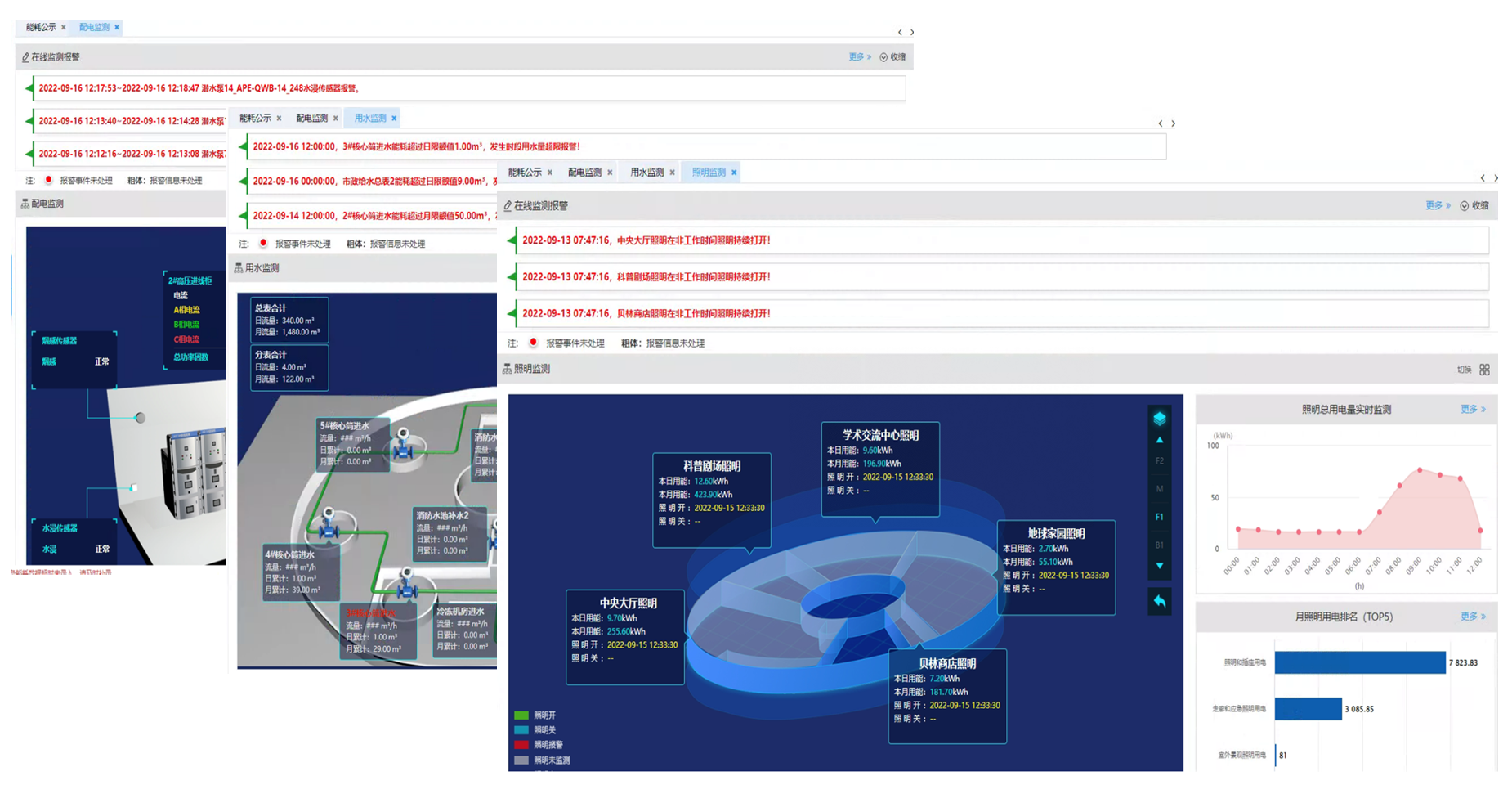【照明监测】照明监测实现对建筑中照明分项各子项用电集中展示以及各楼层分区域用电量统计和开关状态的监测,便对建筑中能耗占比较高的照明进行集中管理和未按照要求关闭照明灯具情况的监管。