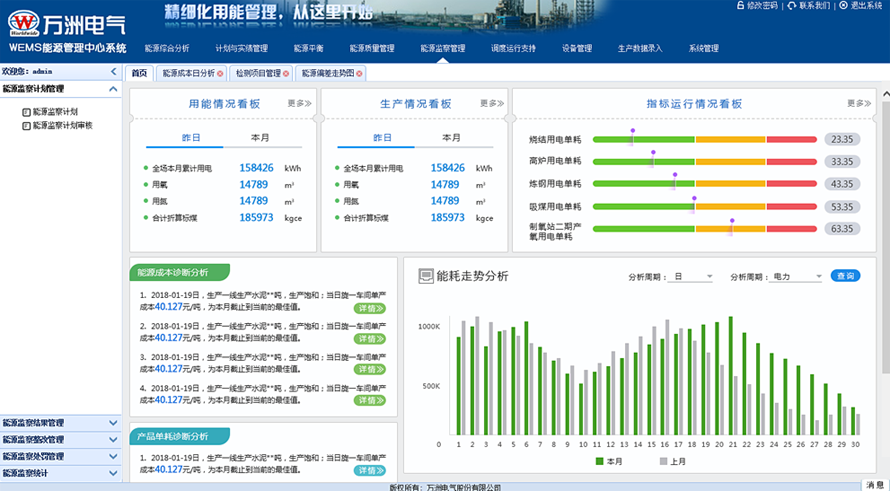 WEMS能源管理中心系统为mksport体育系统节能系列产品之一,通过对生产过程全能源消耗的数据进行采集、加工、分析、处理以实现对能源计划、能源实绩、能源预测、能源质量与物料供应、能源平衡与生产调度等全方位的监管和综合分析。实现统一生产调度、统一能源配给,达到能源精细化管控、优化生产优化能耗的目的,真正起到提高企业生产与能源管理水平、提高企业能源利用效率,降低单位产品综合能耗的作用。